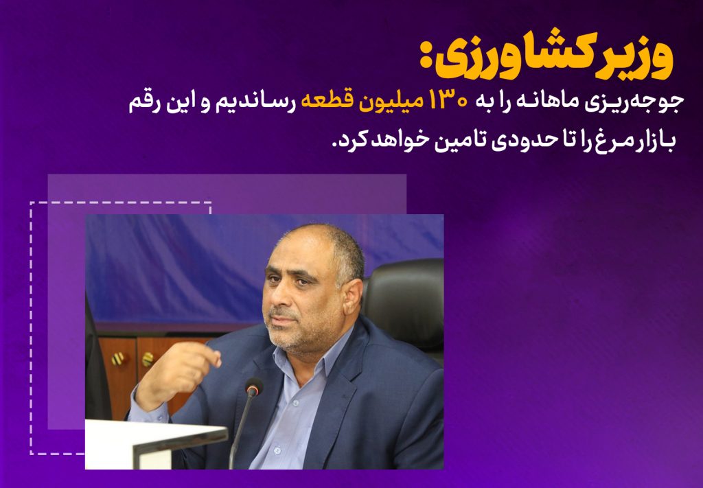 وزیر کشاورزی: جوجهریزی ماهانه را به ۱۳۰ میلیون قطعه رساندیم و این رقم بازار مرغ را تا حدودی تامین خواهد کرد.