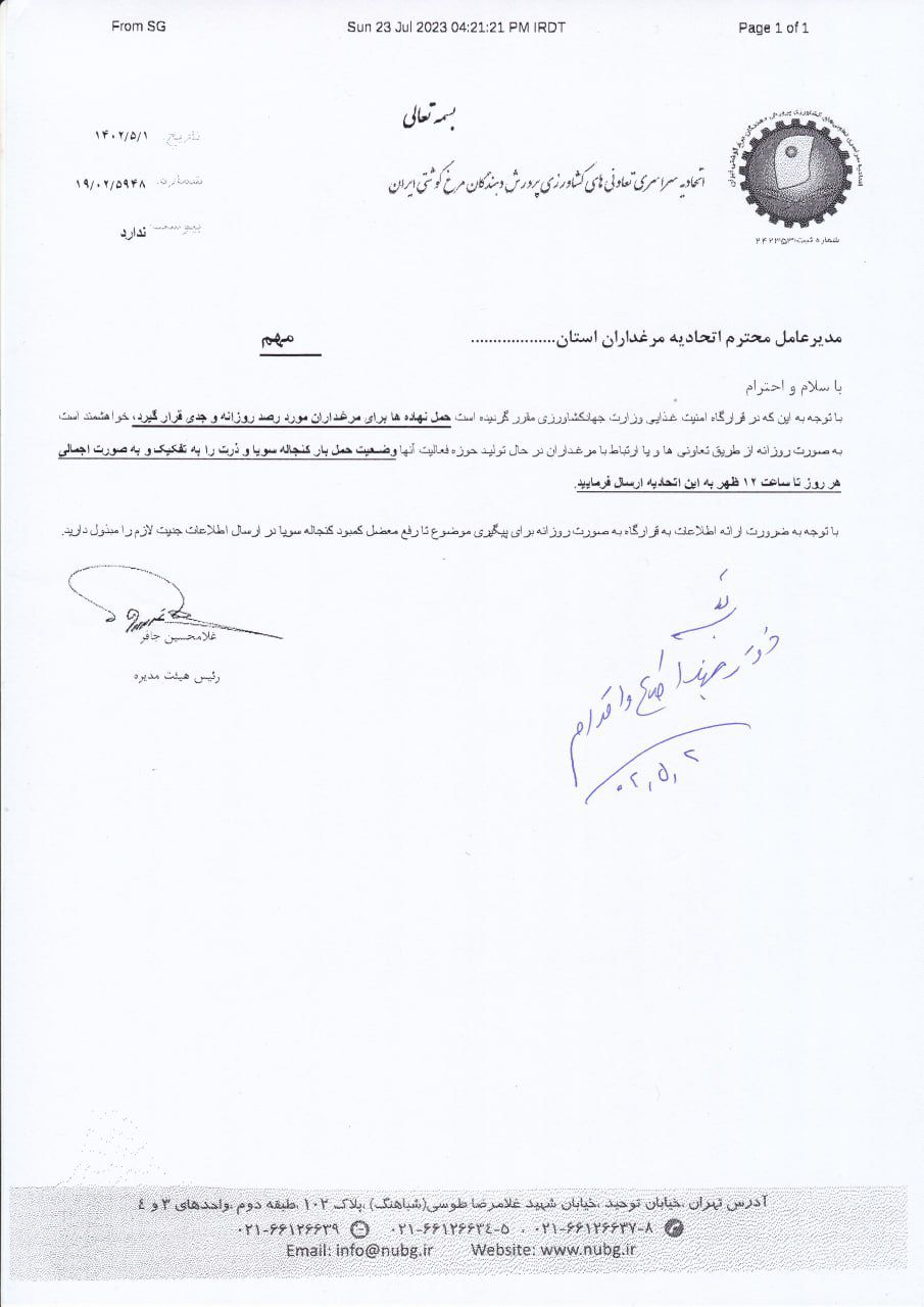 باتوجه به اینکه قرارگاه امنیت غذایی وزارت جهاد کشاورزی مقرر گردیده است حمل نهادهها برای مرغداران مورد رصد روزانه و جدی قرار گیرد، خواهشمند است به صورت روزانه از طریق تعاونیها و با ارتباط با مرغداران درحال تولید حوزه فعالیت آنها وضعیت حمل بار کنجاله سویا و ذرت را به تفکیک و به صورت اجمالی هرروز تا ساعت 12 ظهر به این اتحادیه ارسال فرمایید.