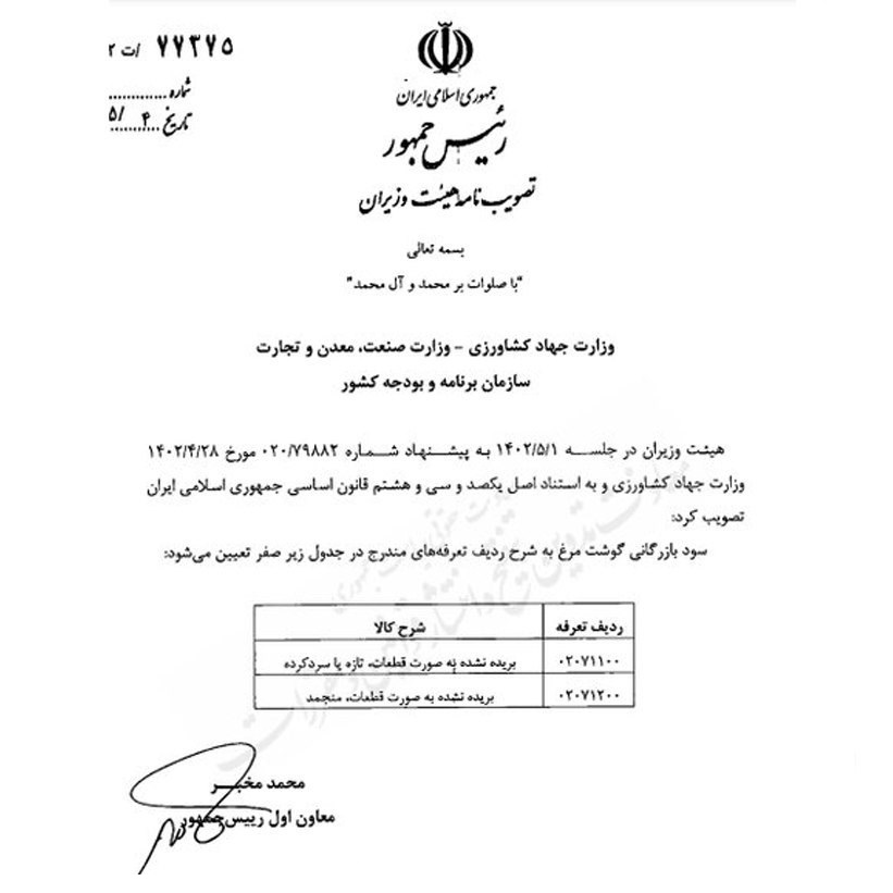 هیات وزیران در جلسه یکم مرداد 1402 به پیشنهاد وزارت جهاد کشاورزی و به استناد اصل 138 قانون اساسی جمهوری اسلامی سود بازرگانی گوشت مرغ (به شرح ردیف تعرفه های مندرج در جدول زیر) را صفر تعیین کرد.